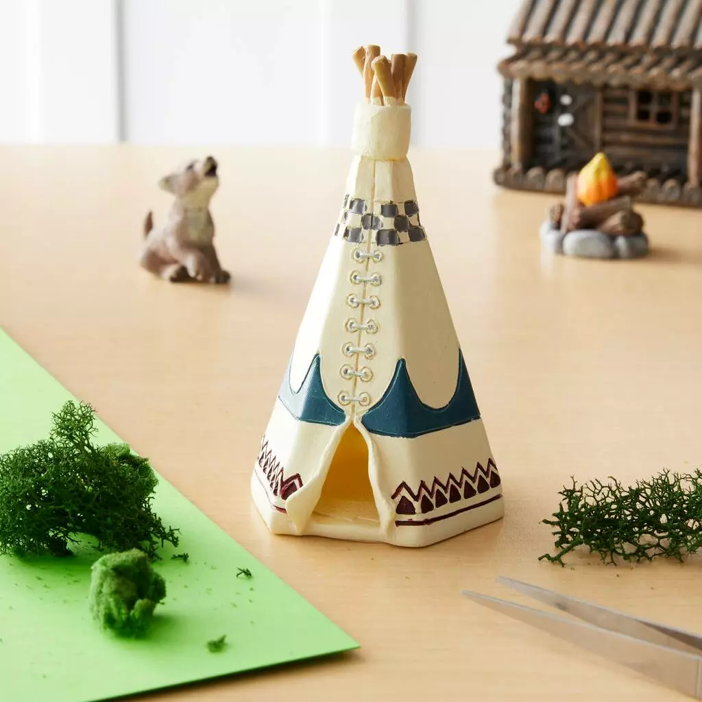 Create a charming nighttime scene set in the great outdoors using this miniature ivory tent. Place with campers, evergreens and forest critters alongside a waterfall to complete the setting.