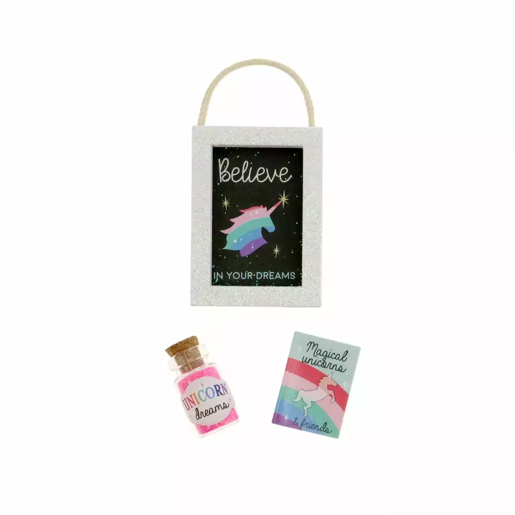 Add charm and personality to a dollhouse play room or display box scene for a unicorn fan in your life with this miniature accessory set. Featuring tiny magical details, these pieces will be the perfect finishing touch for your scenery and diorama projects.
