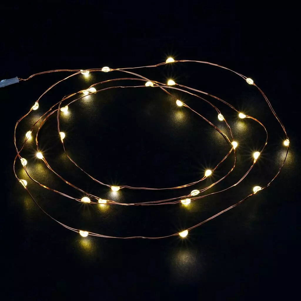 - Each string light has 30 warm white LED lights with 2″ (5.08 cm) spacing