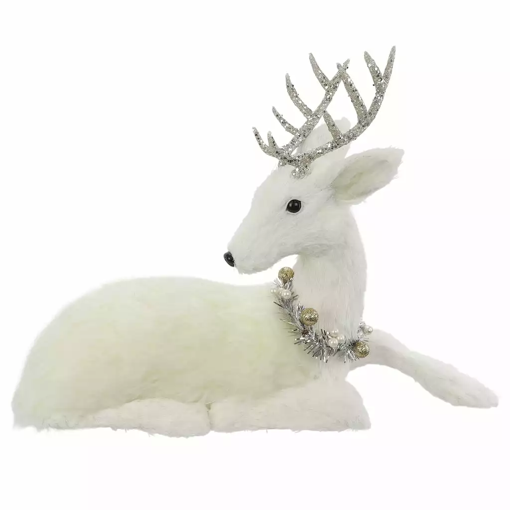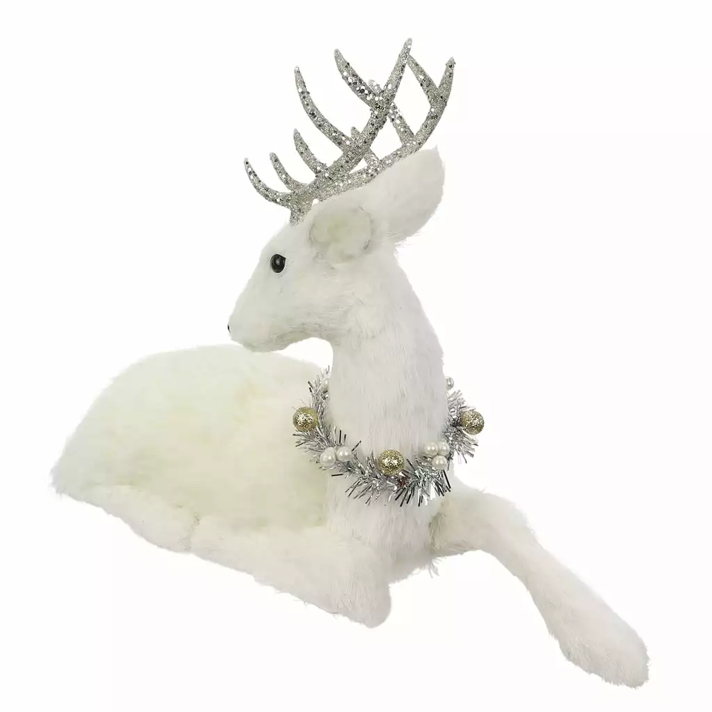 With glittery silver antlers and a wreath of tinsel and ornaments around its neck, this lovely sitting deer figurine is sure to bring festive cheer to your home. Display this charming piece alongside a miniature golden tree decked out in sparkly ornaments on your mantel for the holiday season.