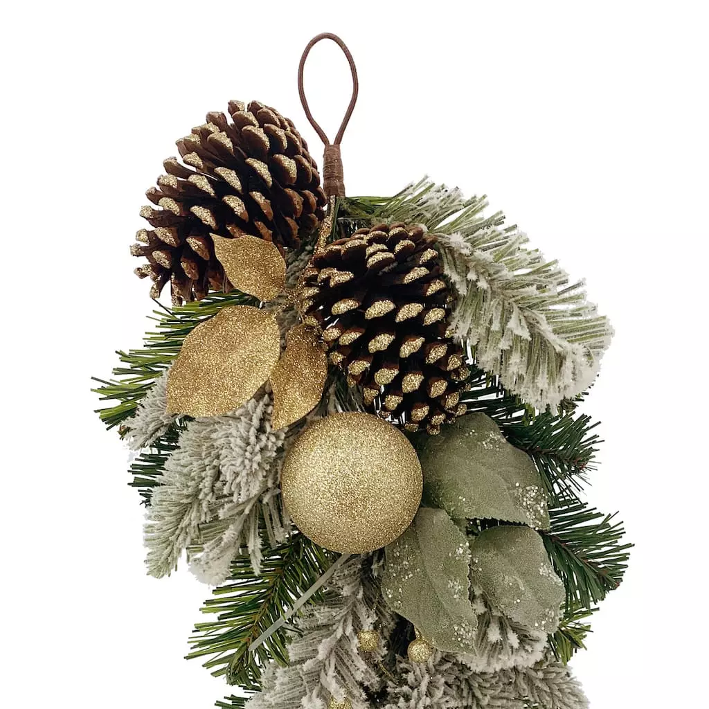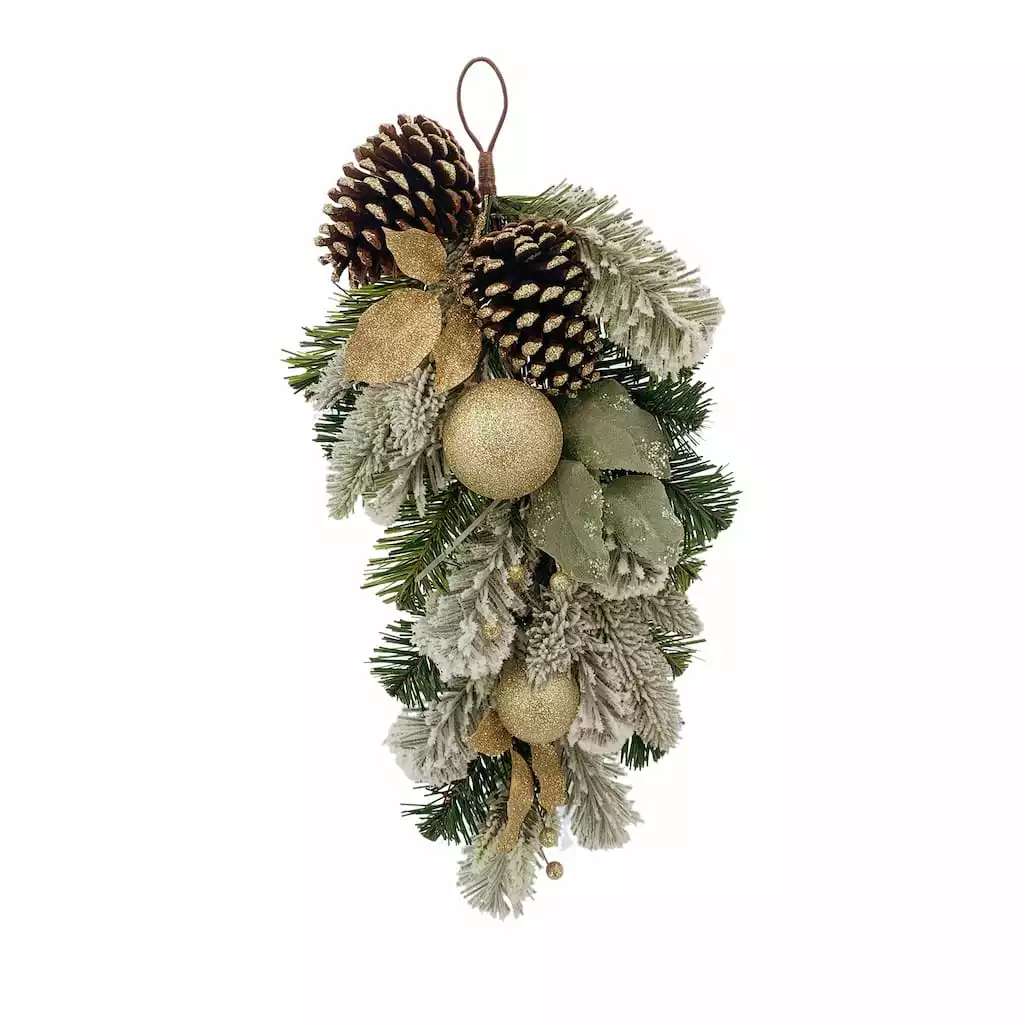 Hang this festive teardrop swag from your door or living room wall to dazzle up your décor with a bit of Christmas magic. With lush pine foliage decked out with gold ornaments and pinecones, this piece is sure to welcome lots of holiday cheer into your home!