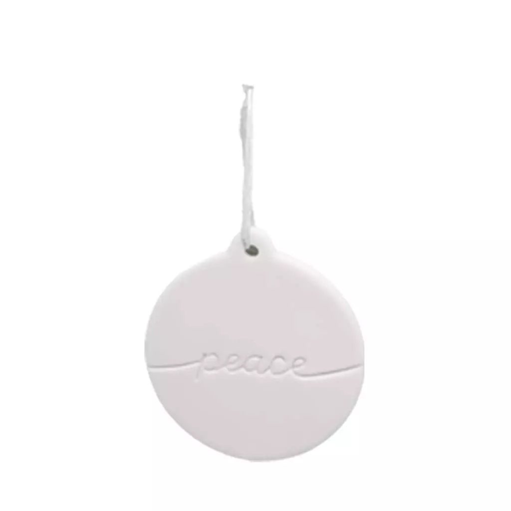 Add your own special flourish to your holiday tree with this unfinished ceramic Christmas ornament, featuring a round shape and the word “peace” engraved across the middle. Use your imagination to give this piece a fun festive touch using paint, glitter, ribbon and more!