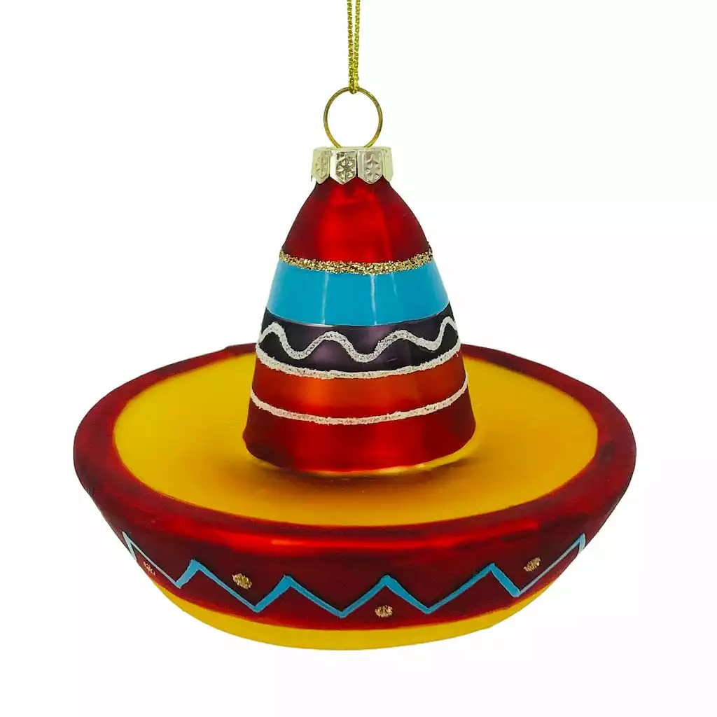 This unique sombrero glass ornament features an array of bright colors and has a loop on top for easy hanging. Put it on your tree, wreath, or any other item for more depth and style. It will make a great addition to your holiday-themed décor.