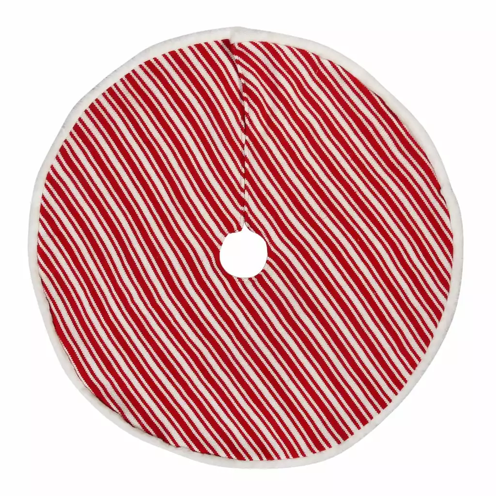 This red and white pencil stripe tree skirt is guaranteed to complement your tree. Team it with bright ornaments and lights for the perfect holiday display.