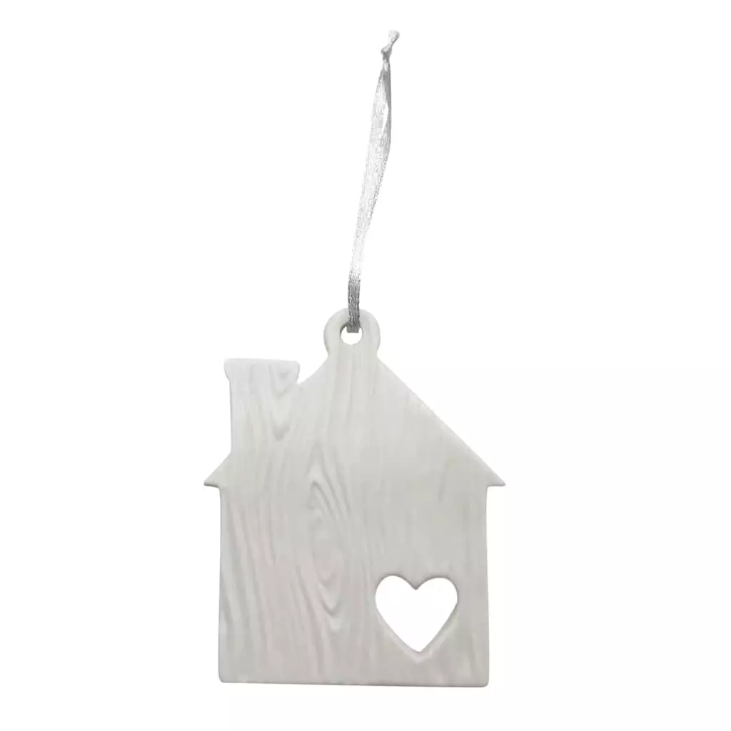 Add your own special flourish to your holiday tree with this unfinished ceramic Christmas ornament, featuring a house shape with a heart cutout and textured woodgrain design. Use your imagination to give this piece a fun festive touch using paint, glitter, ribbon and more!
