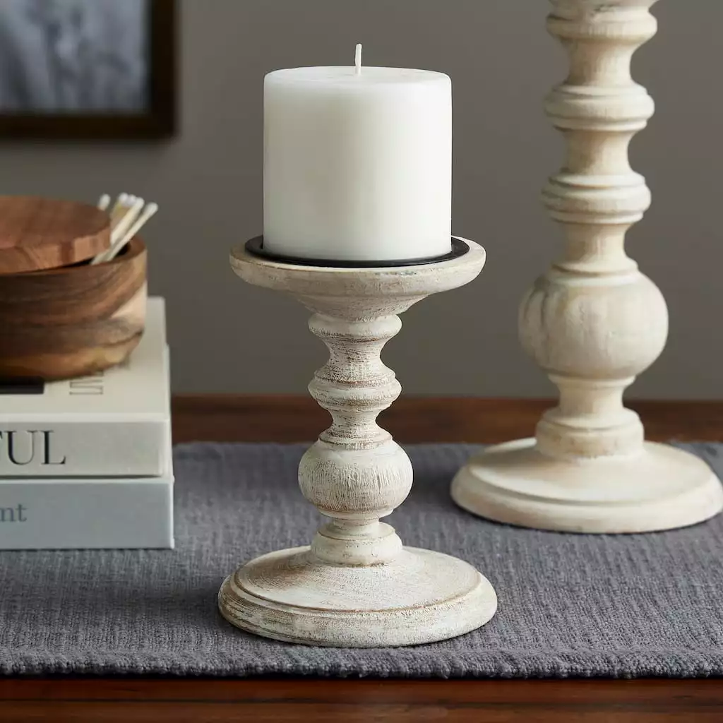 This whitewashed pillar candle holder will look lovely on a corner table. Team it with a vase of dried floral stems to add create a beautiful setup in your living room.