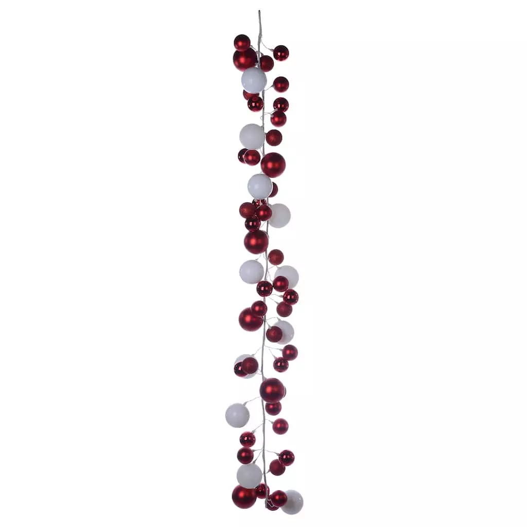 Bring a touch of Christmas magic to your decorating with this lovely garland of shiny red and white ball ornaments. Drape this piece over a doorframe, mantel or bannister as is or with added lights and ribbon for a festive display full of holiday cheer.