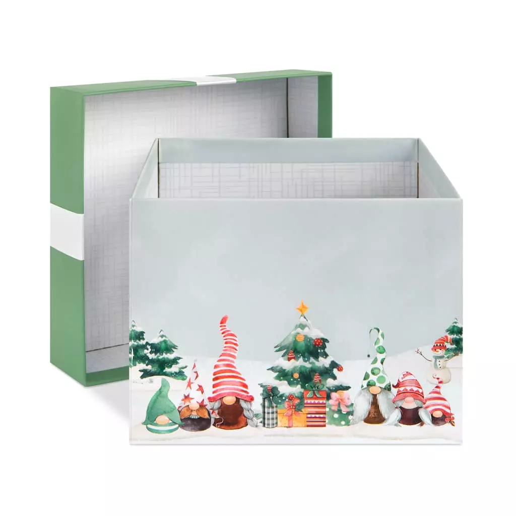 Featuring an adorable design of gnomes in oversized pointy hats celebrating the holidays, this charming box is a fantastic way to dress up your holiday presents with festive flair. With a pretty satin bow and coordinating tag, use for decorating under the tree or to hold a special gift sure to stand out as you celebrate the Christmas season with your loved ones.
