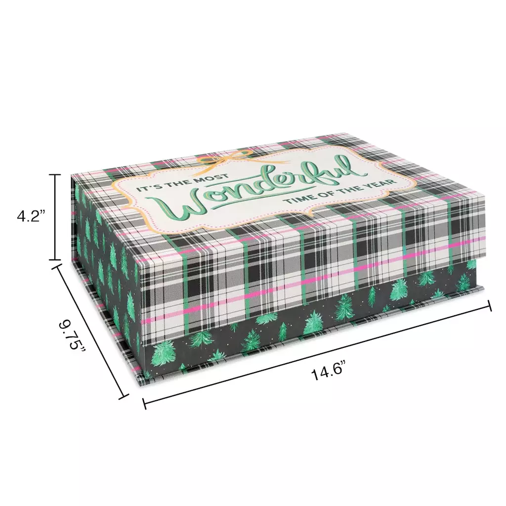 This flip top decorative box is the perfect piece for your home décor and storage. It features a seasonal design with “It’s the most wonderful time of the year”, Christmas trees, and a plaid design on the flap.