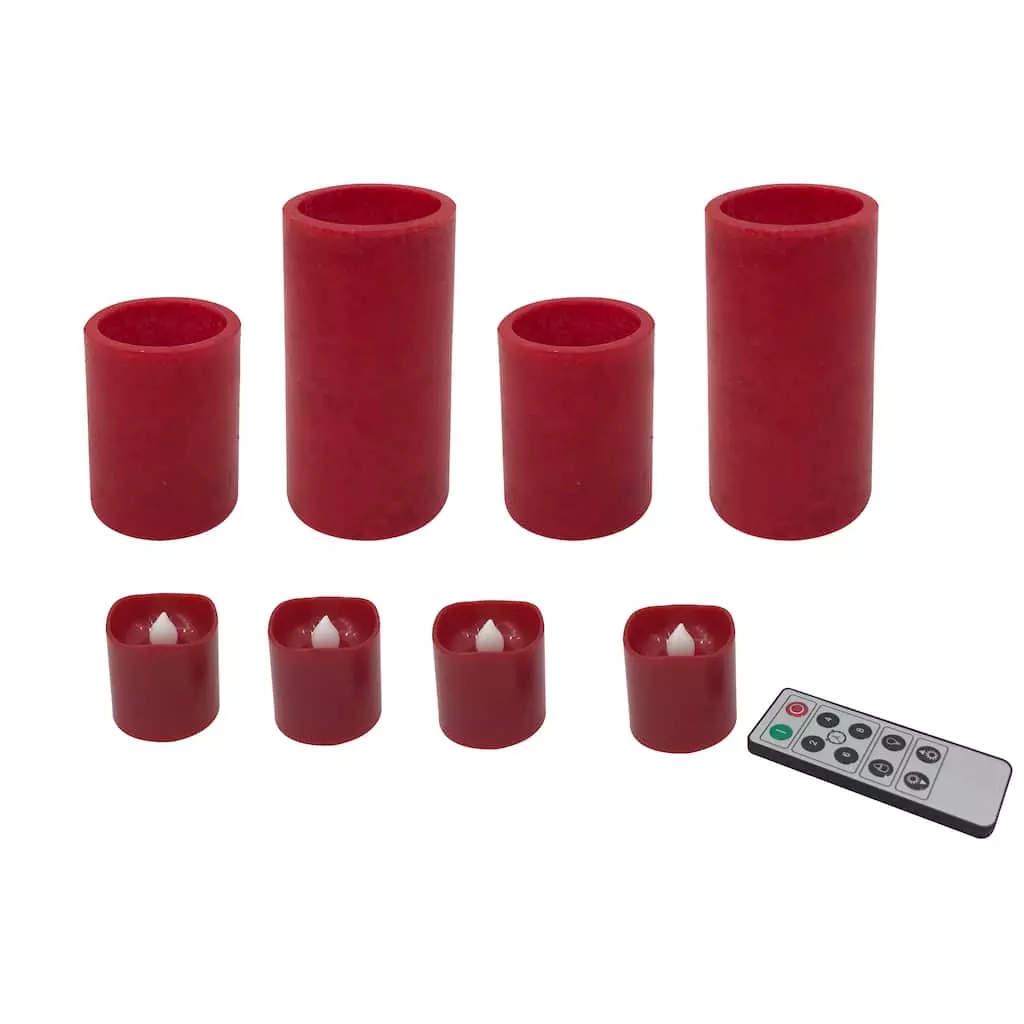 This beautiful red LED candle set includes 8 candles and 1 remote. Perfect for safely adding an ambient charm to your décor, each candle will transform your table, shelf or counter with the push of a button.