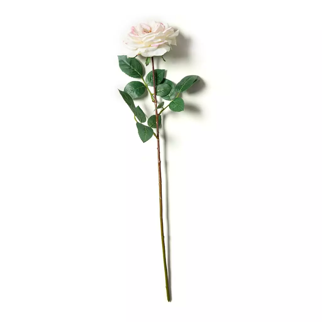 Beautiful single rose looks great in a vase by itself or arranged with other flowers and greenery. It’s perfect for decorating your home or your wedding venue. The white rose has a touch of light pink along its petal edges and looks and feels real to the touch due to its innovative textured coating.