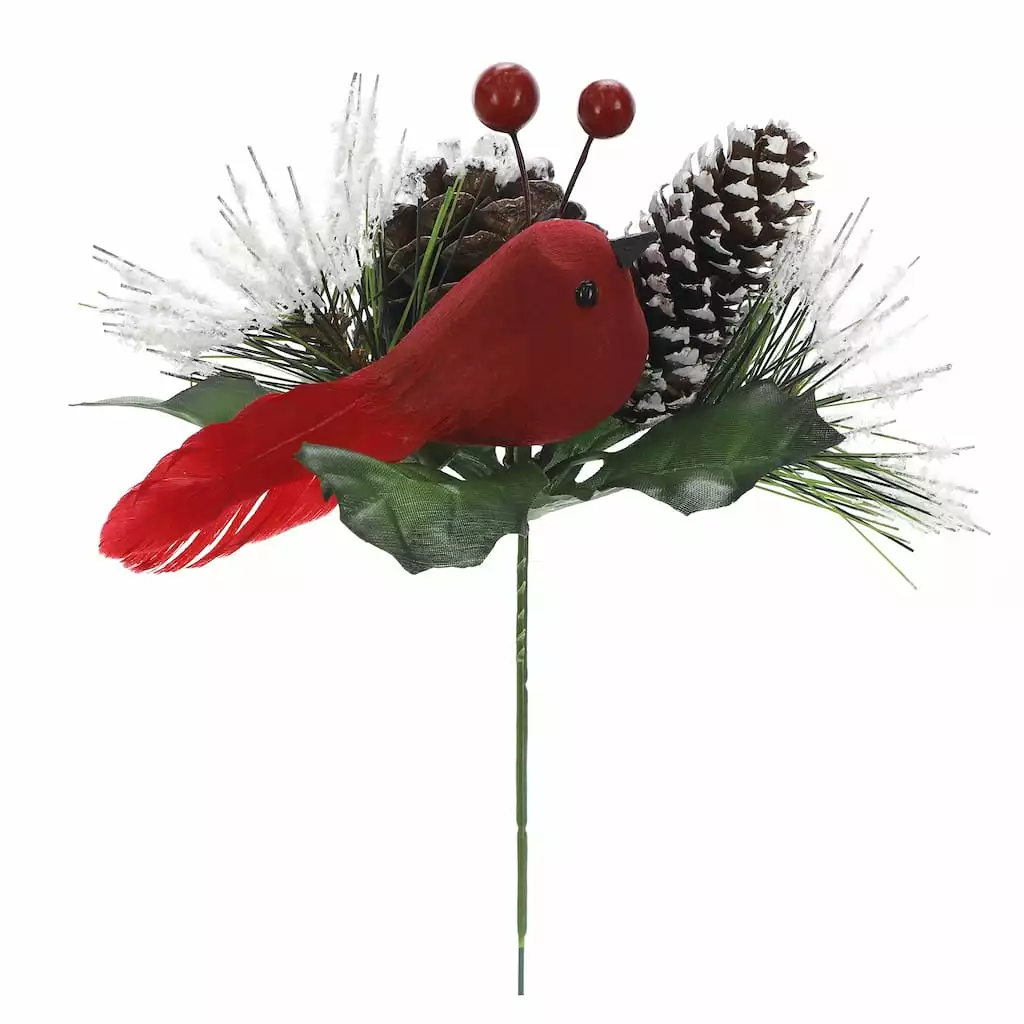Give your holiday wreaths and floral arrangements a lovely touch of charm with this festive snowy pine pick from Ashland. Pinecones and sprigs embellished with berries and a bright red bird, this piece will display beautifully with vibrant red blooms and evergreen branches in a ceramic vase for the Christmas season.