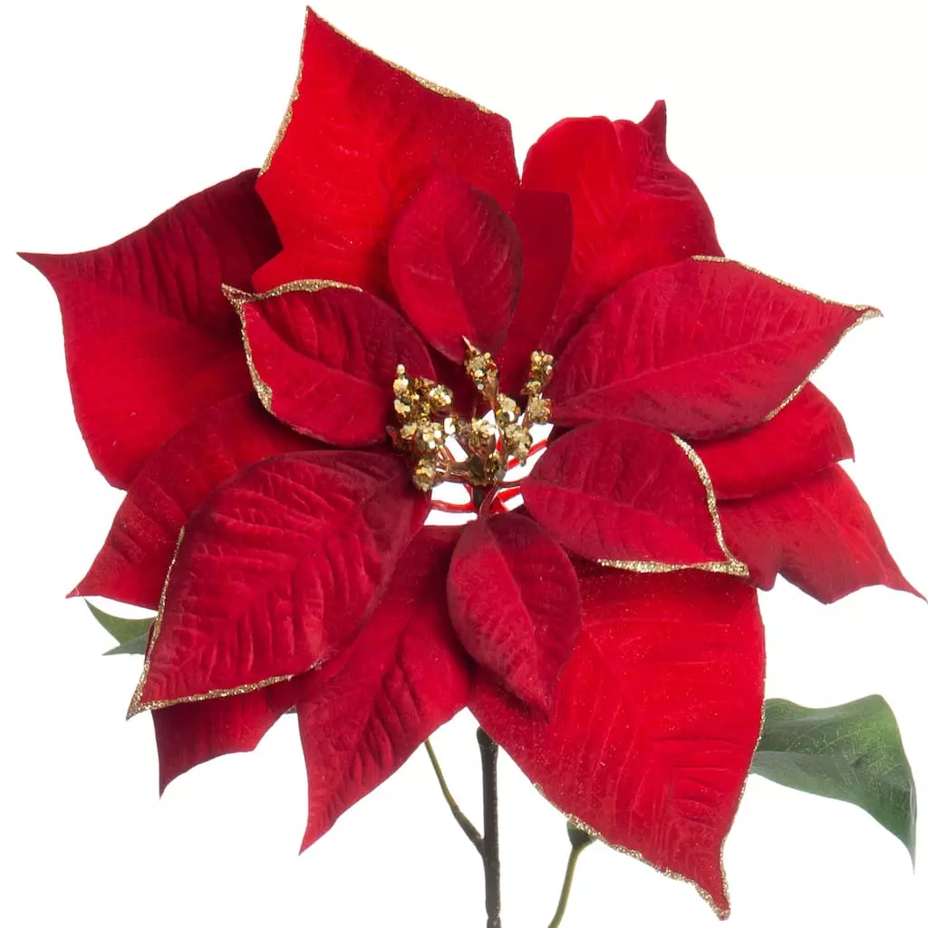 This gorgeous red and gold glitter poinsettia stem is perfect for transforming your DIY holiday floral arrangement. Place it in a bright seasonal container to display on your coffee table or counter.