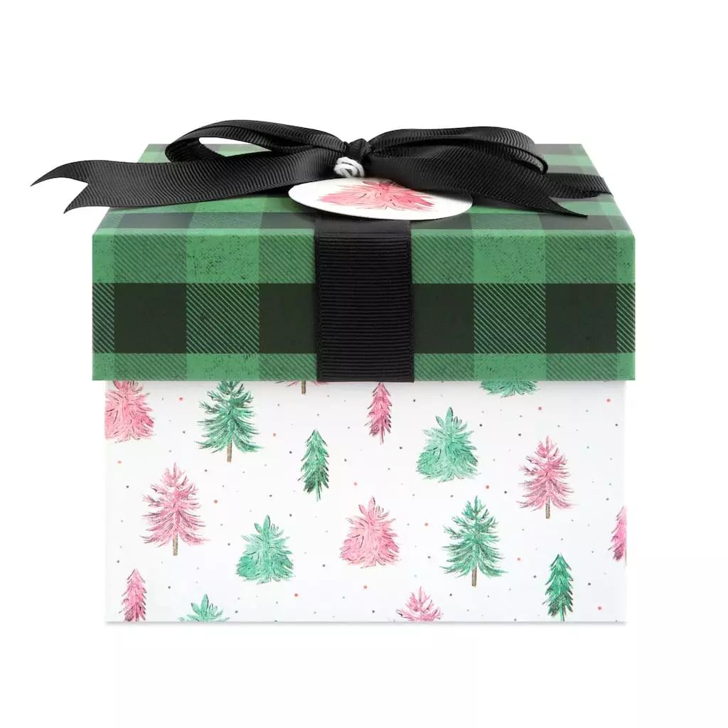 Featuring a fun pattern of tree illustrations with a green buffalo plaid lid, this charming box is a fantastic way to dress up your holiday presents with festive flair. With a pretty satin bow and coordinating tag, use for decorating under the tree or to hold a special gift sure to stand out as you celebrate the Christmas season with your loved ones.