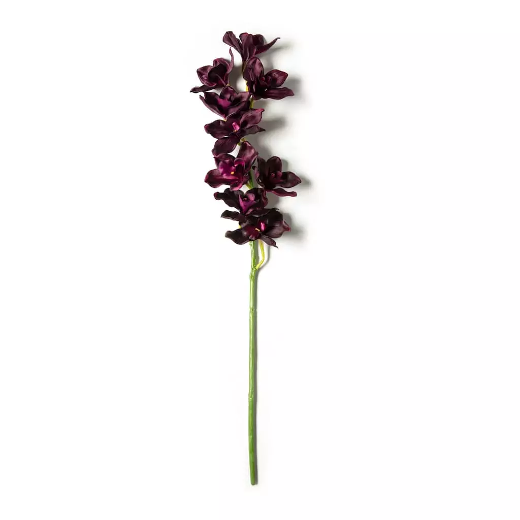 This tropical orchid stem can be used for floral arranging, craft projects and decorative purposes. Featuring oval-shaped petals with pointed ends, the plum cymbidium spray can be used on its own or paired with additional tropical foliage to create a dramatic arrangement.