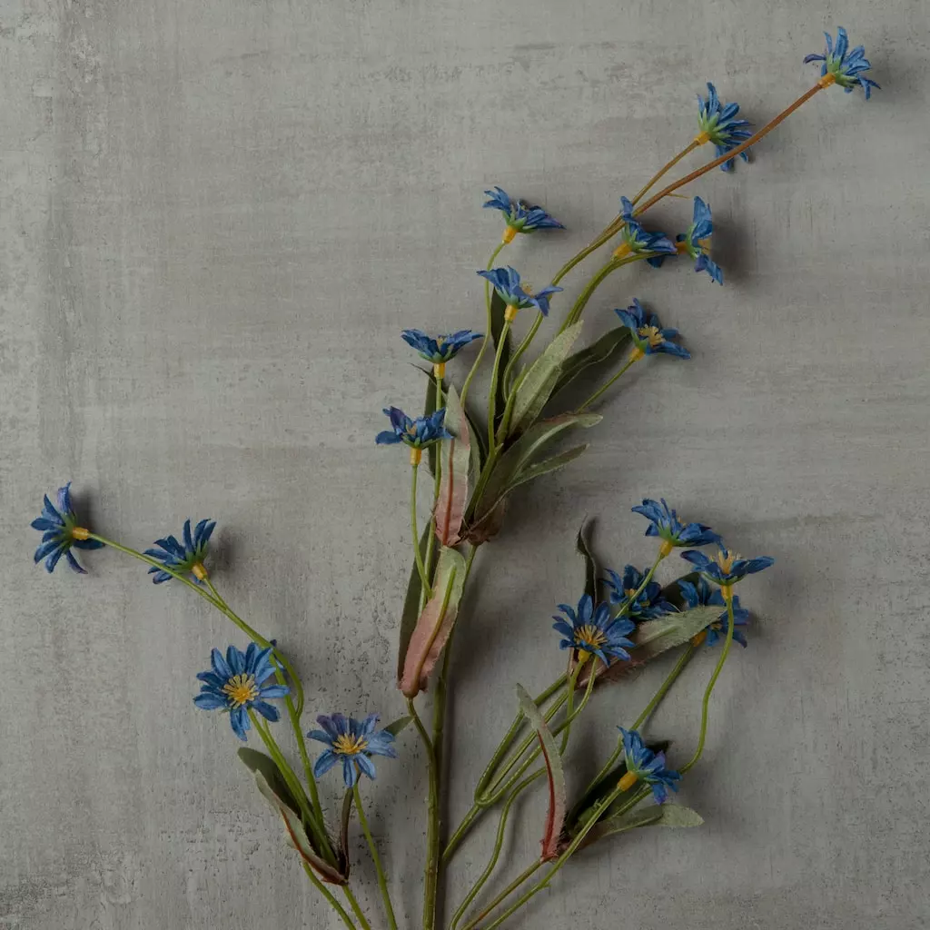 This stem of blue wild daisies is wonderful for adding to floral arrangements or using singularly in a small vase. It is perfect for weddings, special events and other craft projects.